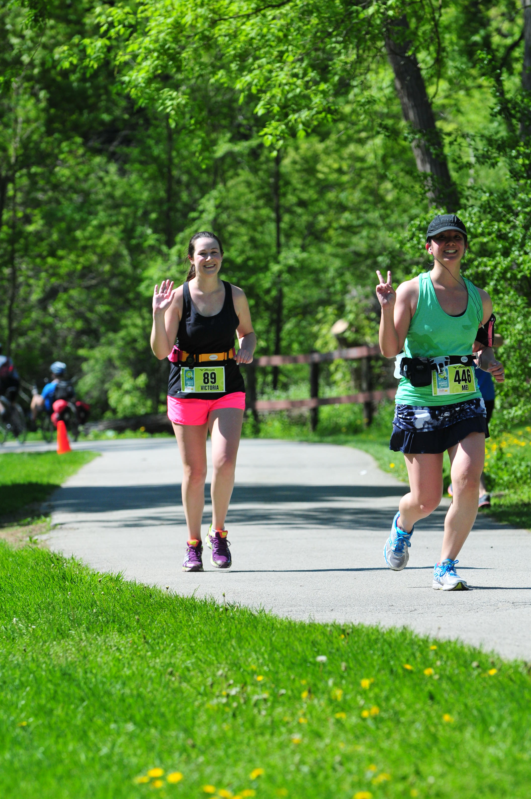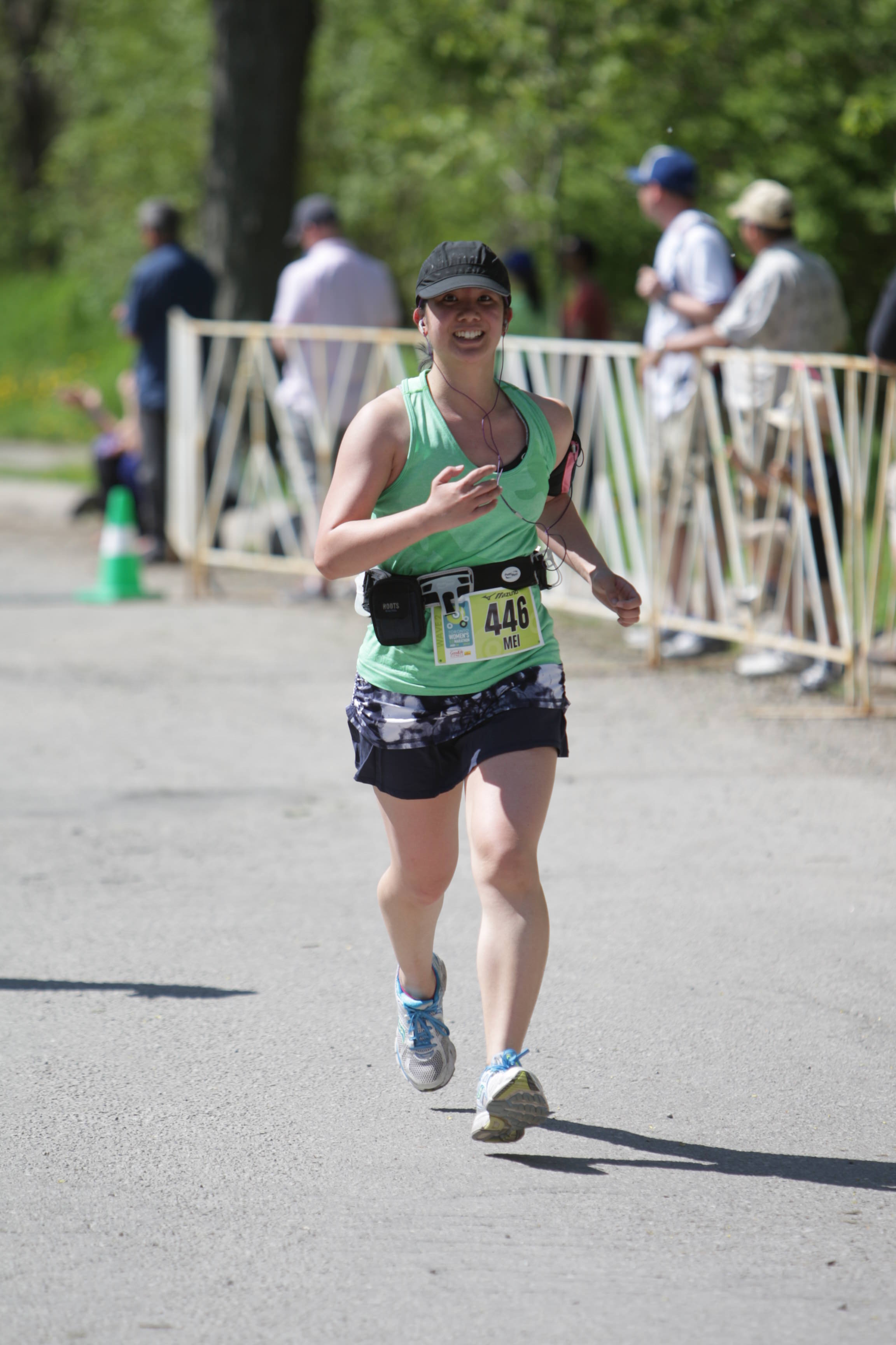 As we continued running it started to get warmer. It had been about 11 celsius when I left for the race that morning. I had heard that it would warm up to 21 celsius by 11 a.m., but less than an hour into the race I was already feeling it. As I mentioned in my recap for last year’s race, there isn’t a lot of shade along the paths. Even though I was wearing a tank top and running skirt, I started to drip with sweat. I should also add that I have poor tolerance to heat due to a brush with heat exhaustion on a road trip through the Australian outback seven years ago (that’s another story for another time). Ever since then I’ve found that heat really affects me and I often have trouble adjusting. It didn’t help that this was my first run of the season in summer like conditions. I was really happy when we hit the first water station (manned by firefighters!) and made sure to take some water and eLoad.