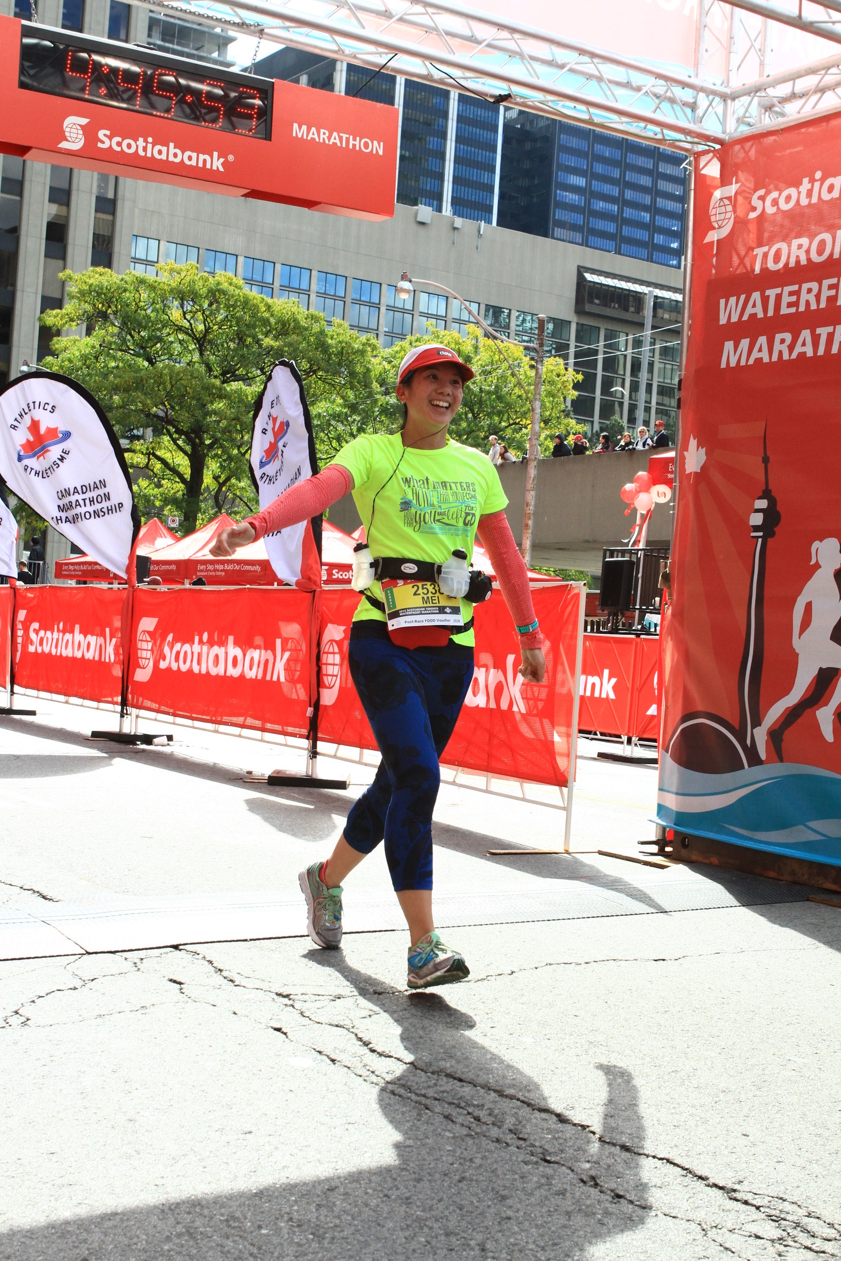 Mei raising her arms and finishing the marathon.