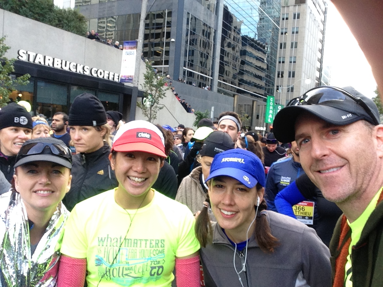 On race day Nanlee and her husband Dave met us at our condo and we walked over to the Sheraton Hotel together. I felt strangely relaxed. We met our running group in the lobby of the hotel, which was full of runners trying to stay warm and taking advantage of the washrooms.
